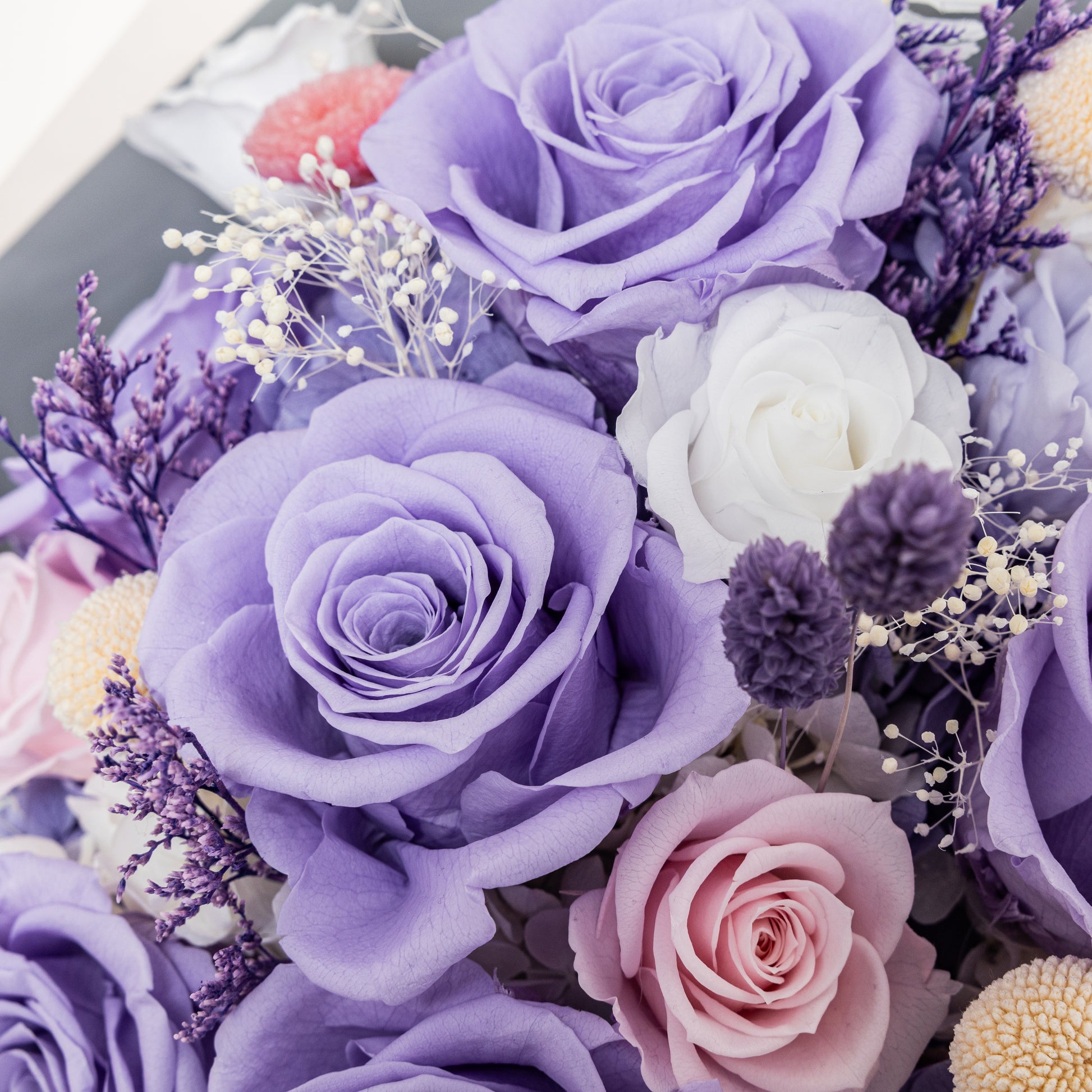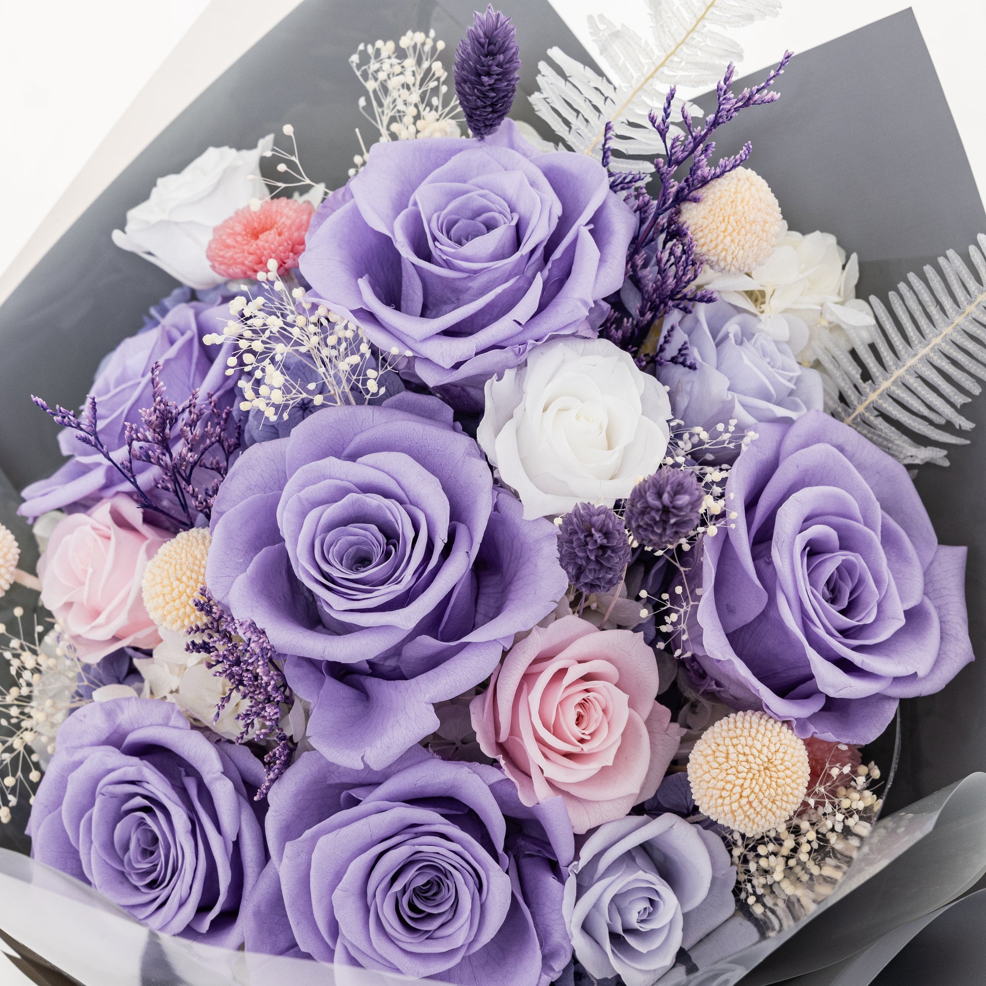 This preserved flower bouquet includes: