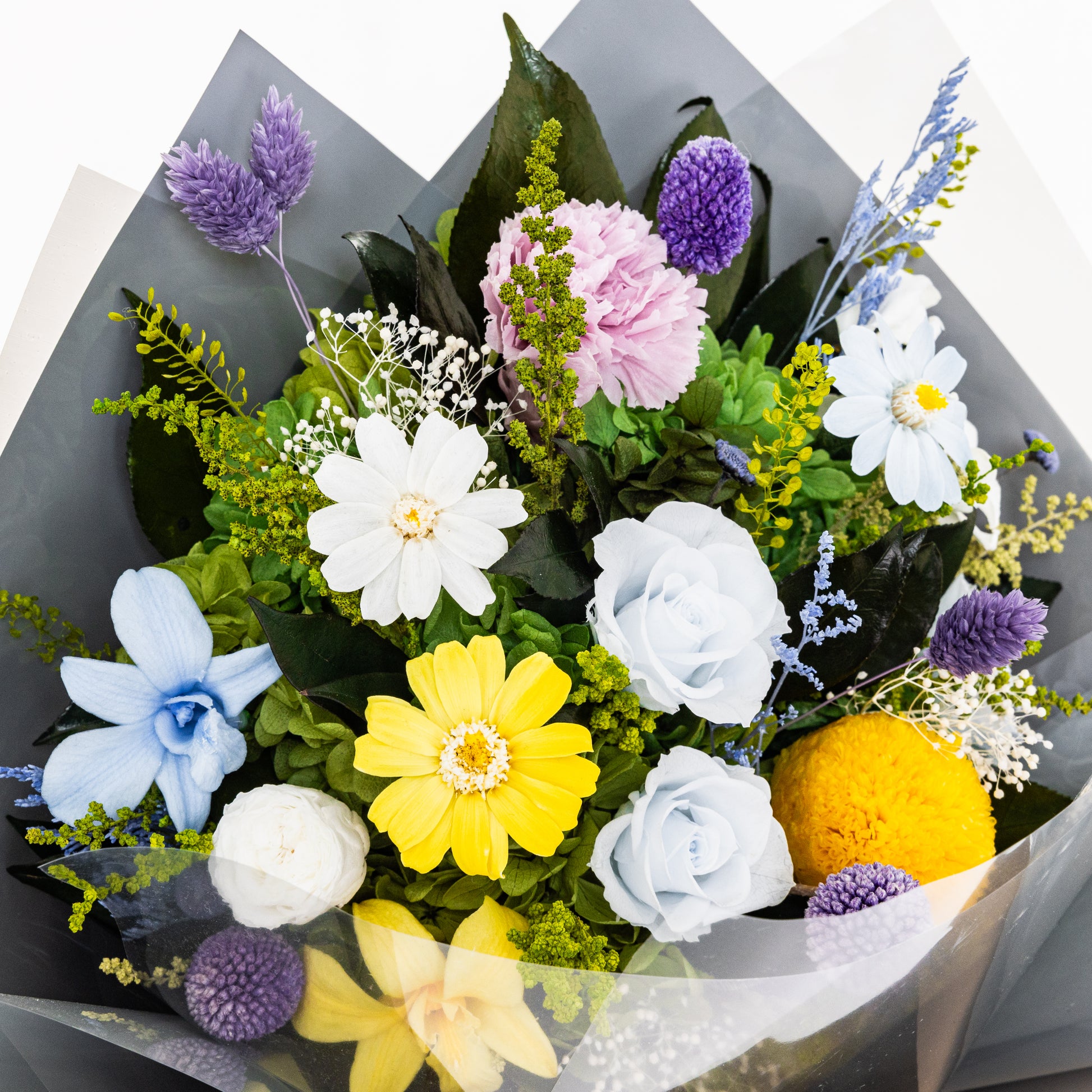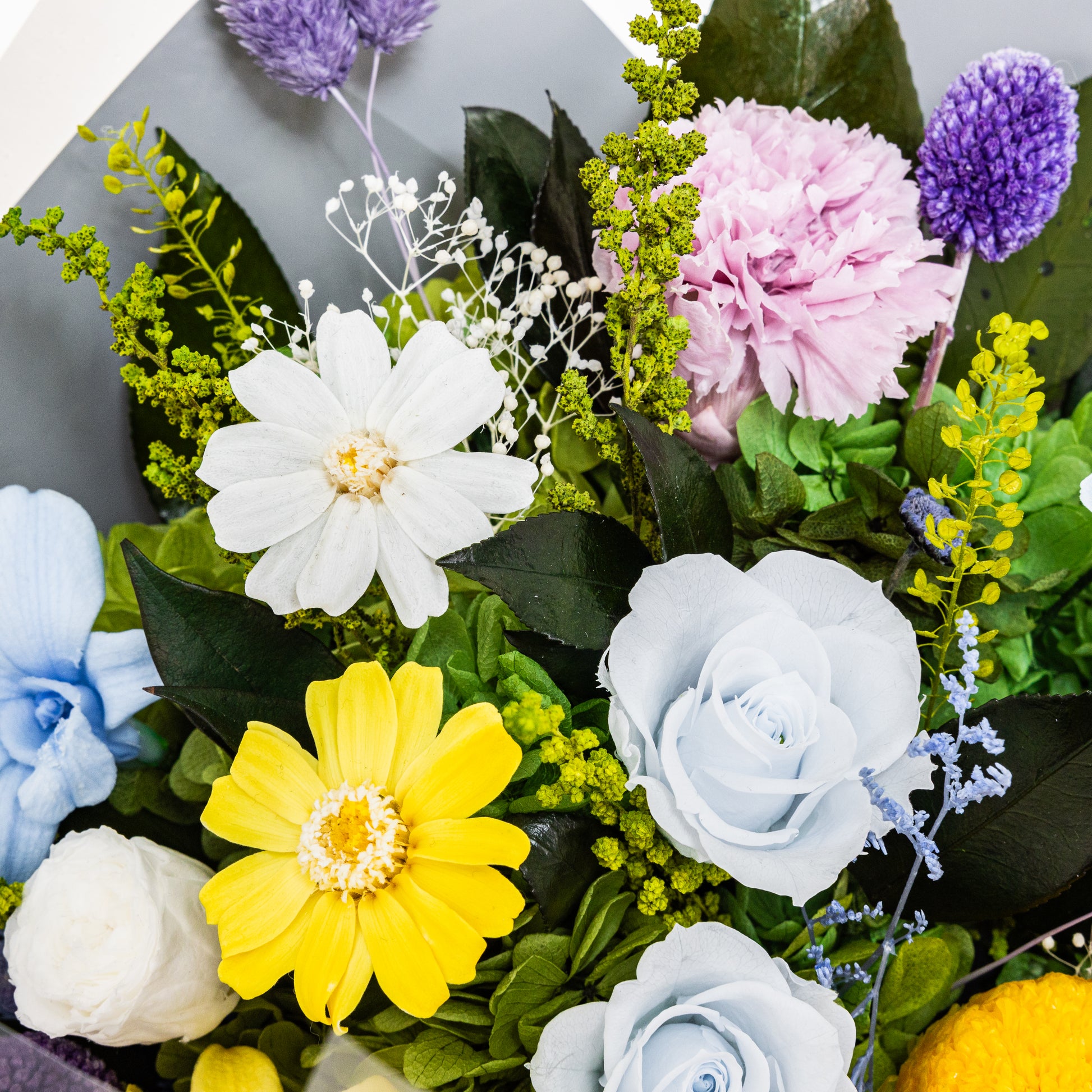 This preserved flower bouquet includes: